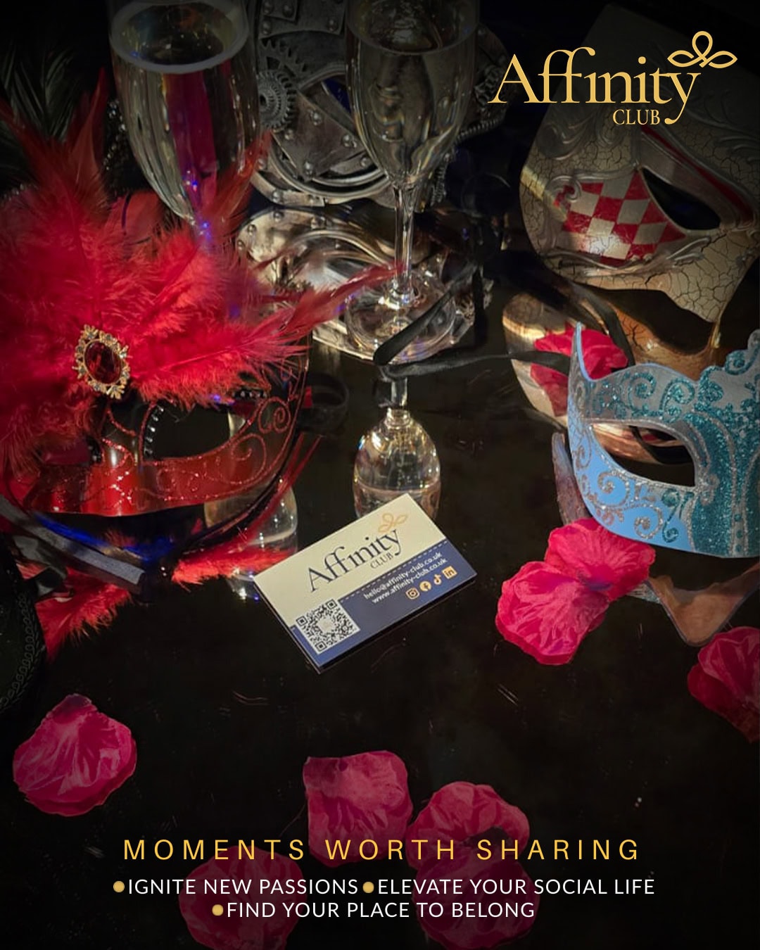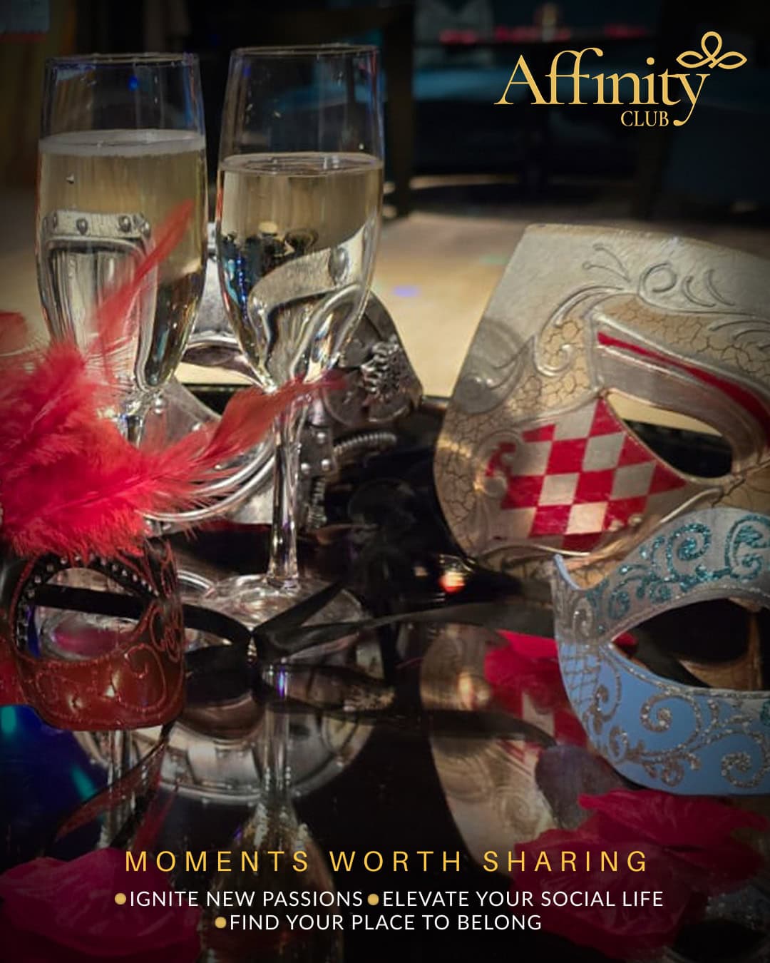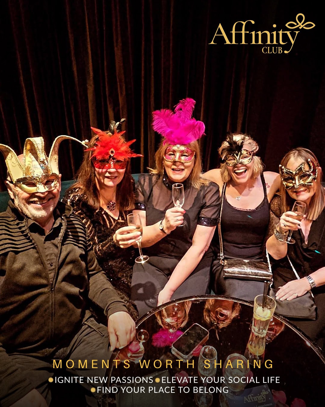 Shimmering lights, bold masks and a captivating atmosphere set the tone from the moment guests arrived. Whether members came with friends, partners or flying solo, the energy in the room was warm, relaxed and effortlessly welcoming — exactly what Affinity is all about.